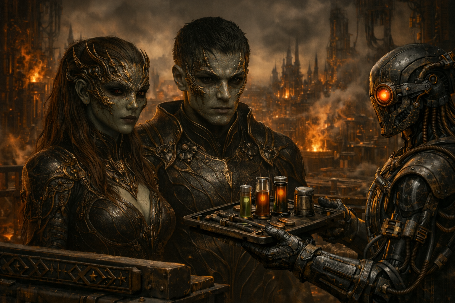 Viennent ensuite les automates, d’abord simples, puis de plus en plus spécialisés. Les K’Sarim ne les inventent pas pour jouer à l’empire : ils les inventent pour éviter le gaspillage biologique. Pourquoi exposer un corps à une vapeur toxique si une machine peut s’en charger ? Pourquoi perdre un esprit compétent dans un accident si l’on peut déléguer ?