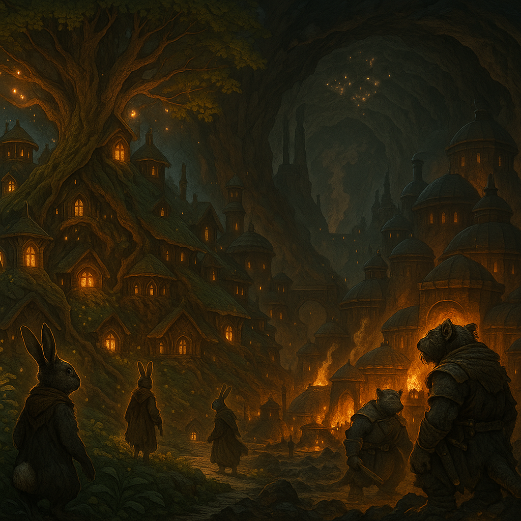 Au croisement des racines millénaires et des tunnels embrasés, Racinebraise est la cité jumelle des Laporidés et des Muslidés. Née d’une alliance improbable entre les ombres de la forêt et la braise des forges, elle est aujourd’hui l’un des lieux les plus stables mais aussi les plus ambivalents de Vallombre. En surface, les terrasses végétales cachées abritent les herboristes et guérisseurs laporidés. Dans les profondeurs, les galeries muslidées résonnent du chant des marteaux et des brasiers éternels. Racinebraise est à la fois le sanctuaire du poison et le bastion de l’acier : une ville où les racines nourrissent les flammes.