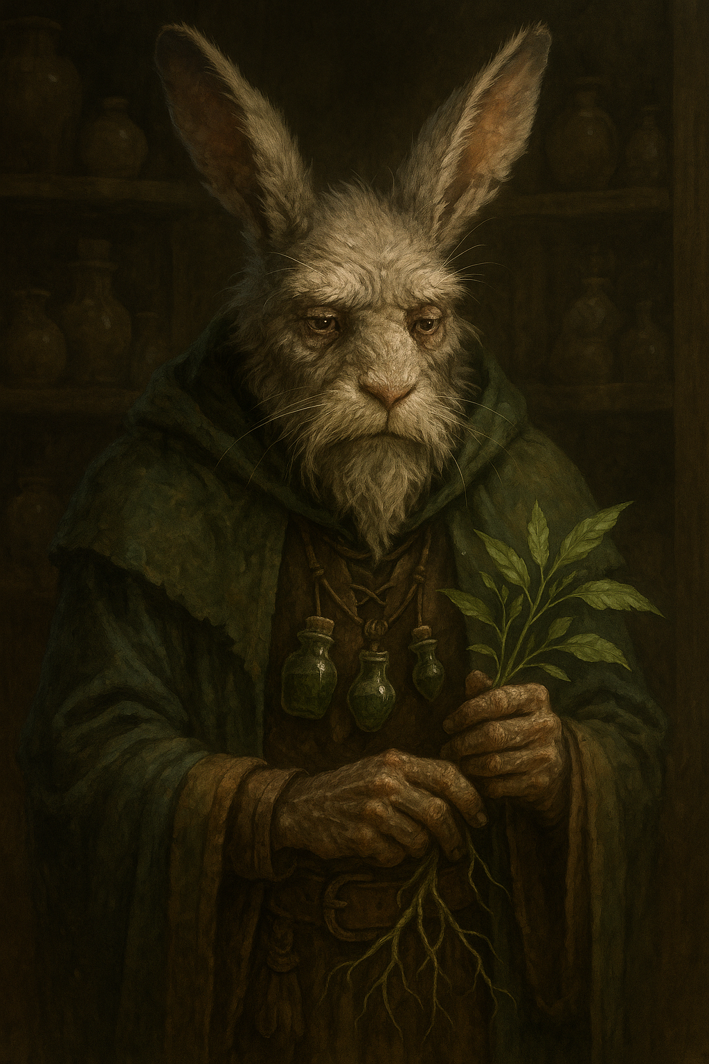 Eryndel est un laporidé au pelage gris blanchi par l’âge, dont les longues oreilles portent des entailles marquées par les rituels anciens. Ses yeux fatigués brillent encore d’une intelligence acérée, et ses mains tremblantes connaissent chaque racine et chaque feuille de Vallombre. Maître herboriste, il est le dépositaire de la mémoire vivante du Voile-Sylvestre et incarne la prudence de la cité. Pour lui, chaque décision doit être pesée comme une décoction : trop de hâte et tout s’empoisonne. Admiré par les anciens et les guérisseurs, il est parfois critiqué par les plus jeunes pour sa lenteur et son conservatisme. Mais personne ne doute que, sans lui, Racinebraise aurait déjà sombré dans ses propres divisions.