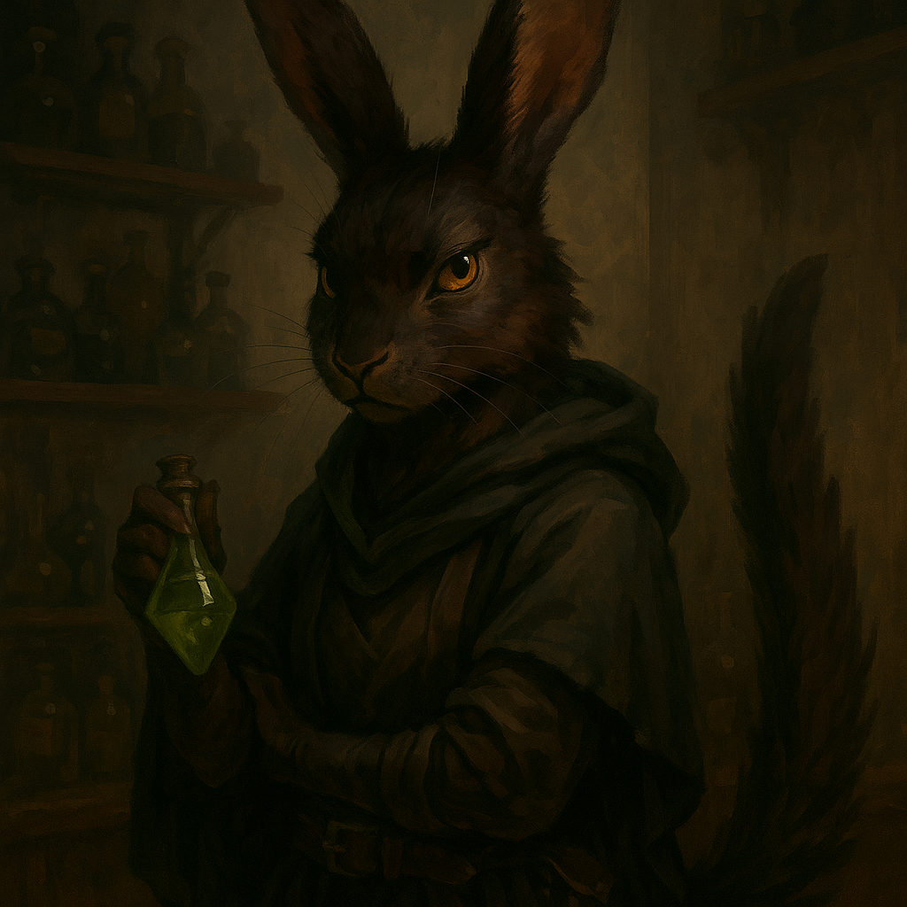 Jeune laporide au pelage brun sombre et au regard d’ambre, Sylra est l’opposée d’Eryndel. Audacieuse, calculatrice, elle a transformé les laboratoires du Voile en un réseau d’influence souterrain. Ses poisons et antidotes circulent dans toute Vallombre, lui assurant un pouvoir invisible mais redoutable. Connue pour son esprit vif et son ambition dévorante, elle représente la jeunesse impatiente, prête à bousculer les traditions. Ses partisans la voient comme l’avenir de Racinebraise, tandis que ses ennemis la craignent comme une vipère dont la morsure peut être fatale. On murmure qu’elle tisse déjà ses filets pour prendre la place d’Eryndel et imposer une ère nouvelle où l’ombre se substituerait à la prudence.