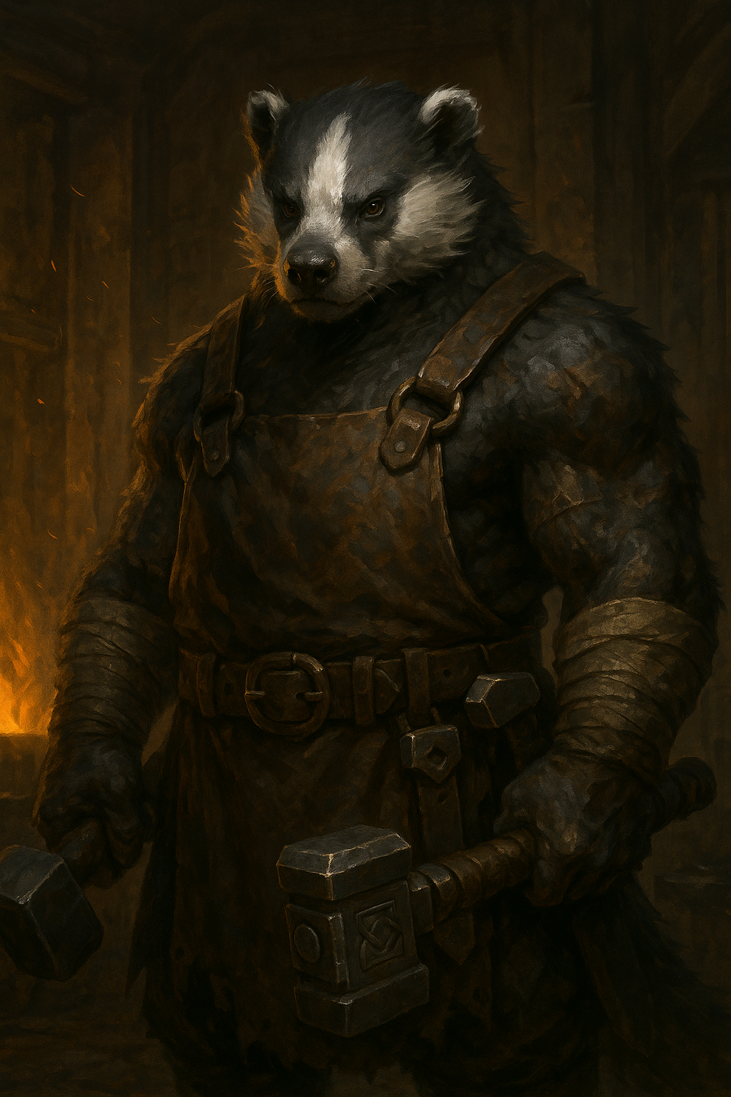 Bjorak est un muslidé colossal au pelage noir, aux bras massifs marqués de brûlures profondes. Chaque cicatrice est l’empreinte d’un feu qui ne s’éteint jamais, et chacun de ses marteaux forgés devient une œuvre à la fois sacrée et létale. Chef de la Confrérie des Marteaux, il croit fermement que la survie repose sur l’utilité : tant que Racinebraise fournit armes et armures à Vallombre, elle sera intouchable. Direct, pragmatique, Bjorak ne s’embarrasse pas de morale. Ses alliés le respectent comme un pilier de force et de stabilité, mais d’autres le dénoncent comme un cynique prêt à vendre son art au plus offrant. Sa voix résonne comme un coup de marteau : brutale, définitive, impossible à ignorer.