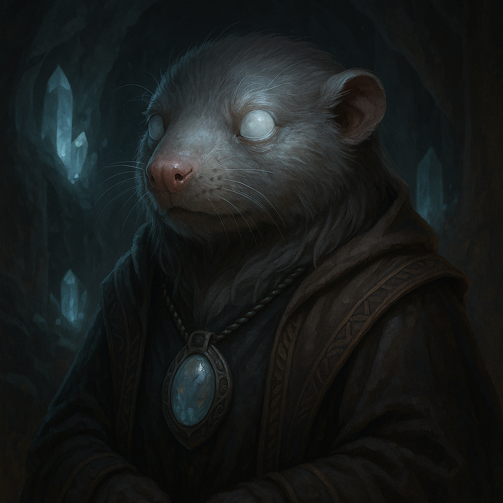 Aveugle depuis son enfance, Ylvara est une muslidée au pelage argenté dont les yeux blancs reflètent la lumière des cristaux sacrés. Chamanesse vénérée, elle passe ses journées dans les Galeries de Cristal, écoutant les murmures de la pierre et les grondements des profondeurs. Ses prophéties sont redoutées et respectées, car aucune grande décision n’est prise sans son augure. Certains la voient comme une prêtresse guidée par les forces de la terre, d’autres comme une manipulatrice qui enveloppe ses ambitions dans le voile du mysticisme. Elle parle peu, mais ses mots tombent comme des oracles impossibles à ignorer, nourrissant à la fois la foi et la peur.